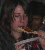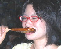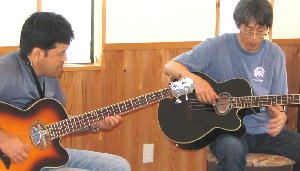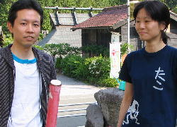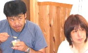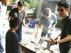 みんな箸と皿もって、「焼けたよ〜!」と声がかかるのを待ってます。右の写真は、今更説明するまでもなく、ナベちゃんとイタちゃんなのですが、注目は、イタちゃんのシャツ!