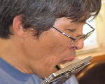 左から、バイオリン・純くん、同じくバイオリン・ご存じ大平楽座オーナー、チェロ・紘子さん、ビオラ・まさやん。とここまでは、昨年も参加メンバー。