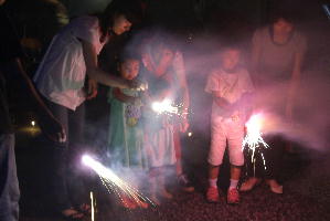 雨が降っているので、打ち上げ花火はやめにして、シートの屋根の下からやりました。