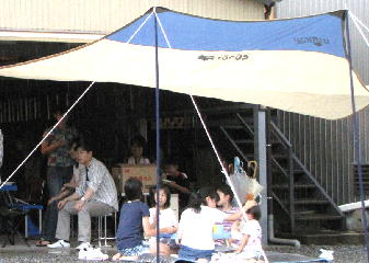 雨が降ってしまったので、シートを張ったその下でバーベキューです。