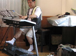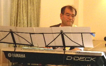 ただ、ミノさんは、新しく買ったという電子ピアノを持ってくるには持ってきたのですが、楽譜共々接続ケープルを忘れてきたで大騒ぎ。仕方ないので、D-DECKで演奏してます。カマさんのサイレントベース?も、なかなか良い音がしてます。