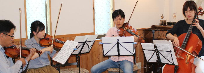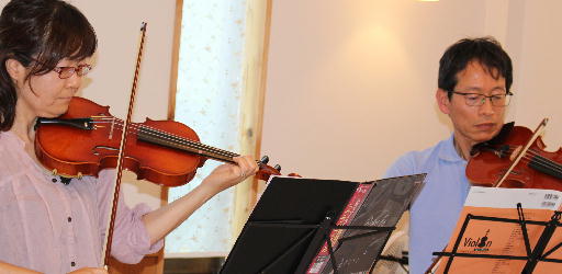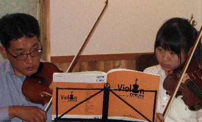 | その頃、部屋の中では、ユウナちゃんが純一君と共に、バイオリンの練習をしておりました。 ユウナちゃんも、もう高校2年生なんだそうな。豊橋ユースオーケストラのメンバーとのこと。 |