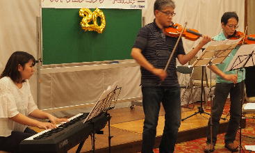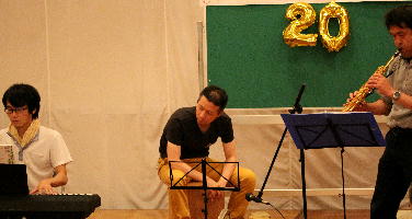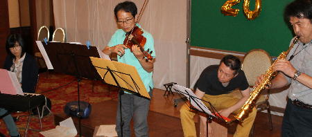 電子ピアノ・happa、ヴァイオリン・ハル君。カホン・ナベちゃん、そして、サックス・クニさん。 |