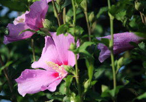 前日には気がつきませんでしたが、朝起きたら母屋の傍に、ムクゲが綺麗に咲いておりました。 |