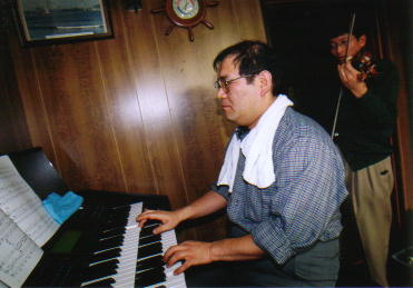右の写真は、バイオリンの弓で指導する鬼の音楽監督!ちょっとカッコイイ。 |